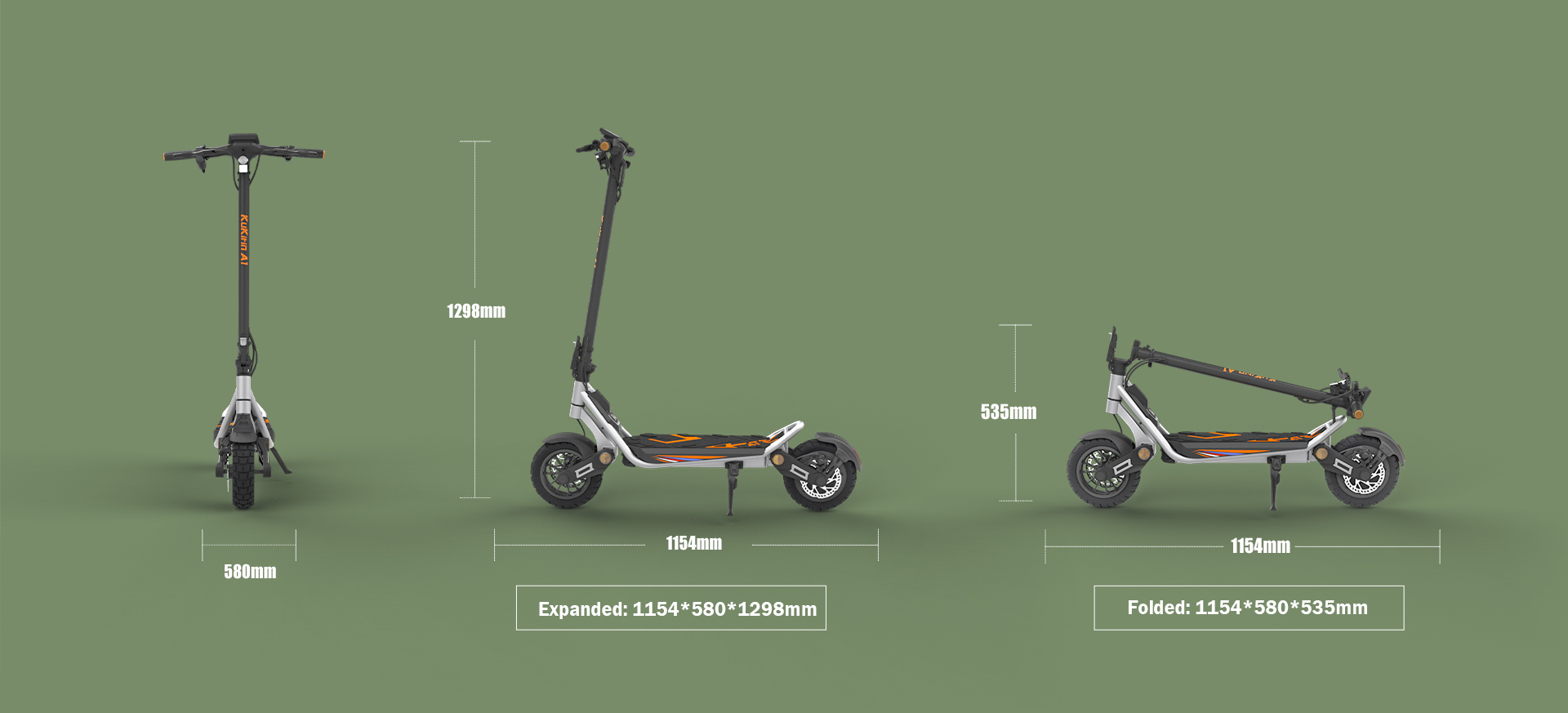 The KuKirin A1 electric scooter boasts a smart folding structure. When in the expanded state, it has dimensions of 1154mm (length) * 580mm (width) * 1298mm (height), ensuring a sturdy and comfortable riding setup. Once folded, it reduces to a compact size of 1154mm * 580mm * 535mm, which makes it highly convenient for storage in small areas or for transporting during your daily travels — an ideal solution for city dwellers seeking flexibility in their commute.