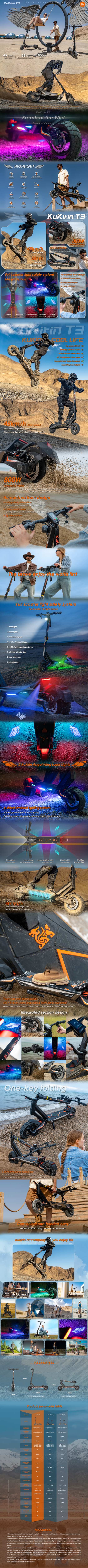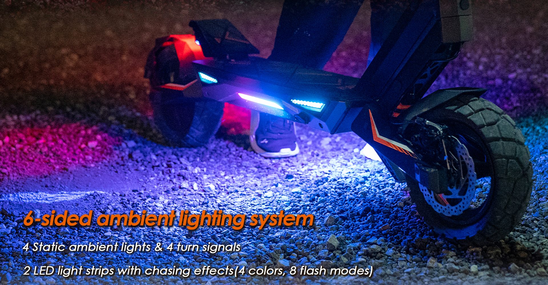 The KuKirin T3 boasts a striking 6-sided ambient lighting system that enhances both style and safety. It integrates 4 static ambient lights, 4 turn signals, and 2 LED light strips with chasing effects (offering 4 colors and 8 flash modes). Whether you’re riding at night or indicating turns, this dynamic lighting setup ensures you’re visible and stylish on every journey.